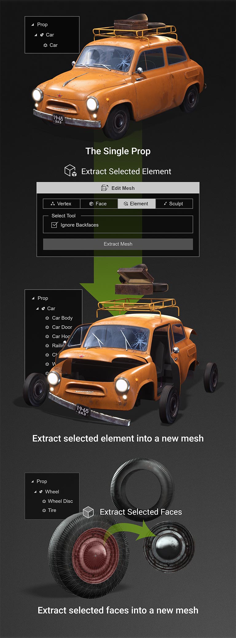 The first step to animate a 3D prop is to well prepare its animatable parts, CC has all the tools to combine mesh elements or separate sub items, also be able to extract items from selected faces, and make them into a new prop.