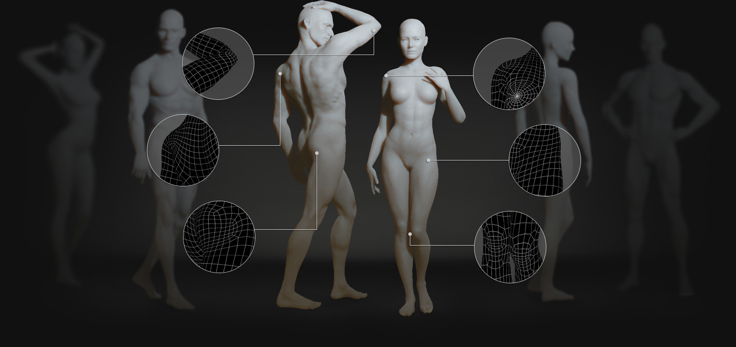 CC5 introduces pristine 3D human topology with flexible subdivision levels for just the right amount of detail. Its groundbreaking HD morph system revitalizes CC3+ characters, delivering high-resolution definition while effortlessly baking textures for lower subdivision levels.