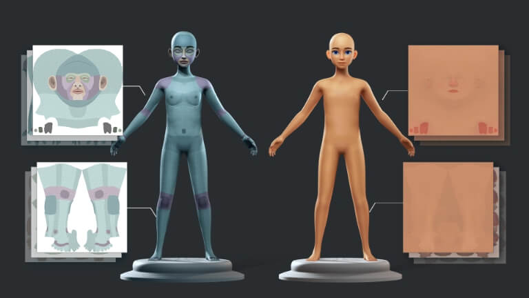 The foundational model with a full skeletal rig is provided in FBX format, along with a comprehensive range of facial morphs for animating expressions. In addition, eyes, brows, teeth, and tongue are individualized components, ready for customization. Designers have the flexibility to modify the character's body shape or paint textures using tools such as Blender or Substance Painter. By keeping the topology and UVs consistentent, characters can seamlessly transfer to and from Character Character for additional adjustments, outfiting, posing, and animation control.