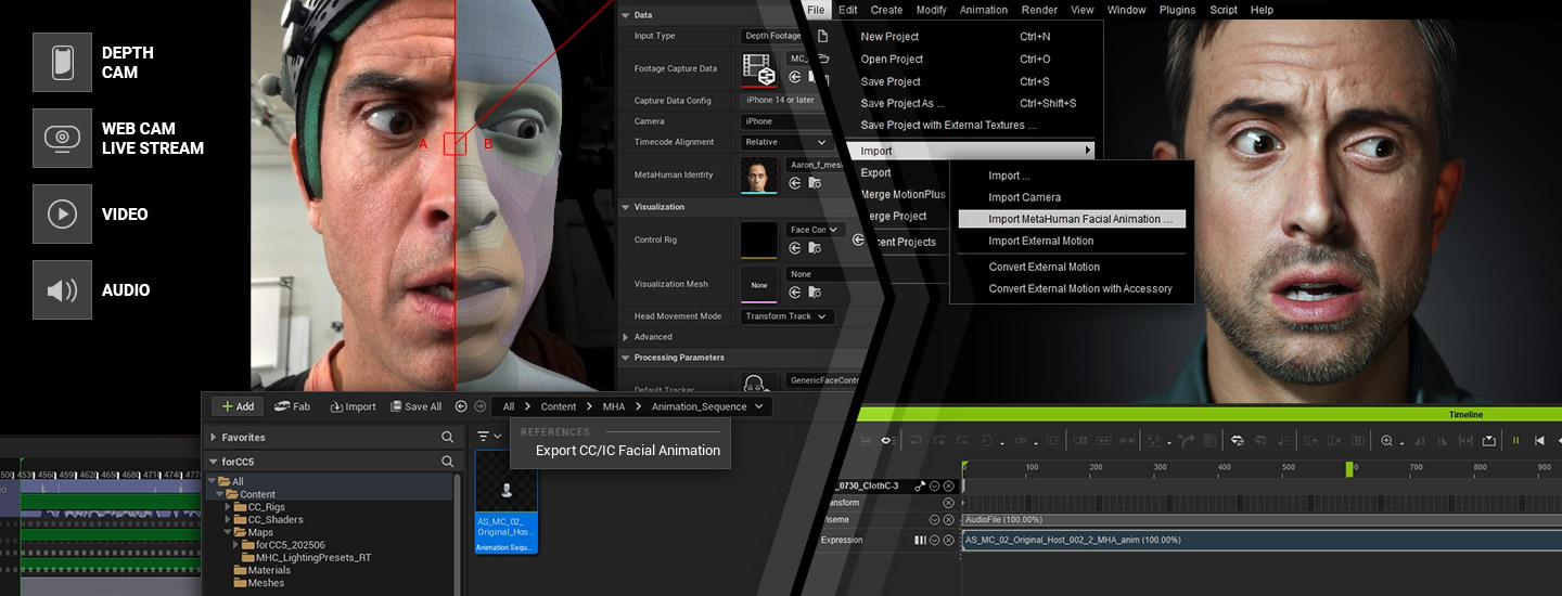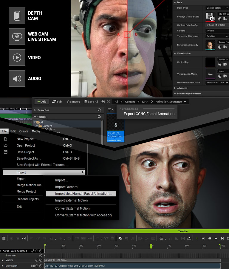 CC5 HD characters integrate seamlessly with iClone Motion LIVE for iPhone and AccuFACE video-footage tracking, while fully compatible with the MetaHuman Animator facial mocap workflow.