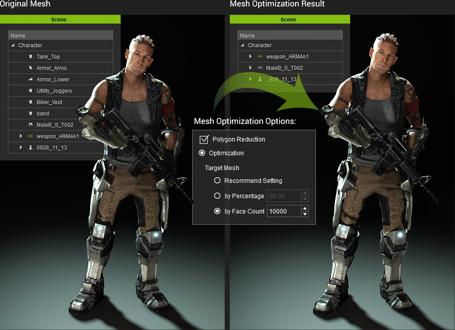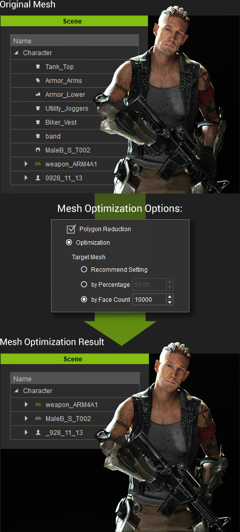 Used for individual mesh optimization, reduce the polygon count while keeping the mesh structure and material numbers.