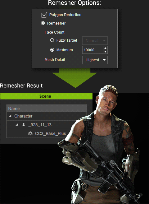 Complete control over the reduction options from one central panel to set bone count, polygon count, texture size, and facial details. Save custom profiles for repetitive conversion processes.