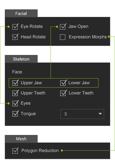 When a character is farther away from the camera, the facial animation data including hundreds of expression morphs and lip shapes become redundant. The Facial Reduction panel allows designers to optionally take out facial blendshapes, teeth and tongue, facial bones for the optimal realtime performance.