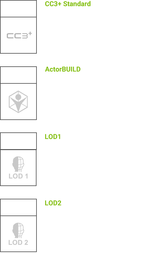 | Character Level | Subdivision Export | CC Avatar(CC3+) | ActorBUILD | LOD 1 | LOD 2 |