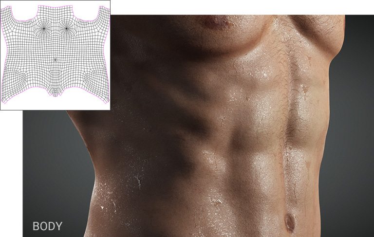 The skin is designed according to segments and follows the layering logic of real human skin from Skin Base to Body Hair. Through the intuitive workflow, apply and manage skin effects in every phase of the design process to achieve quality skin designs with a myriad of possible looks and styles.