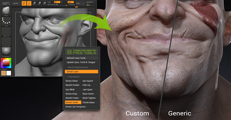 Master convincing expressions and distinct personalities by using Face Tools. Easily transfer foundational expressions from Character Creator to ZBrush for customization, and selectively update the expressions for instant turnarounds.