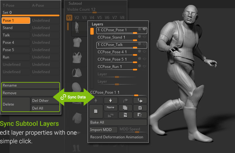 Serving as a macro to existing ZBrush features, Pose Tools seamlessly syncs up with ZBrush layers and their associated subtools.