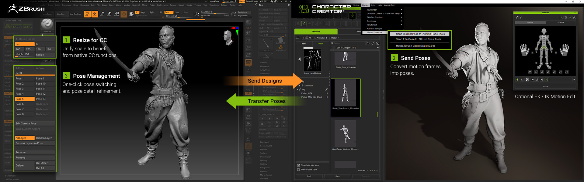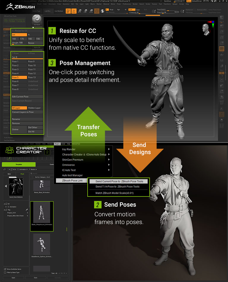 ZBrush Pose Link for Character Creator significantly amplifies the power of ZBrush Pose Tools, resulting in a powerful combo. When combined, the two plugins provide the following benefits: