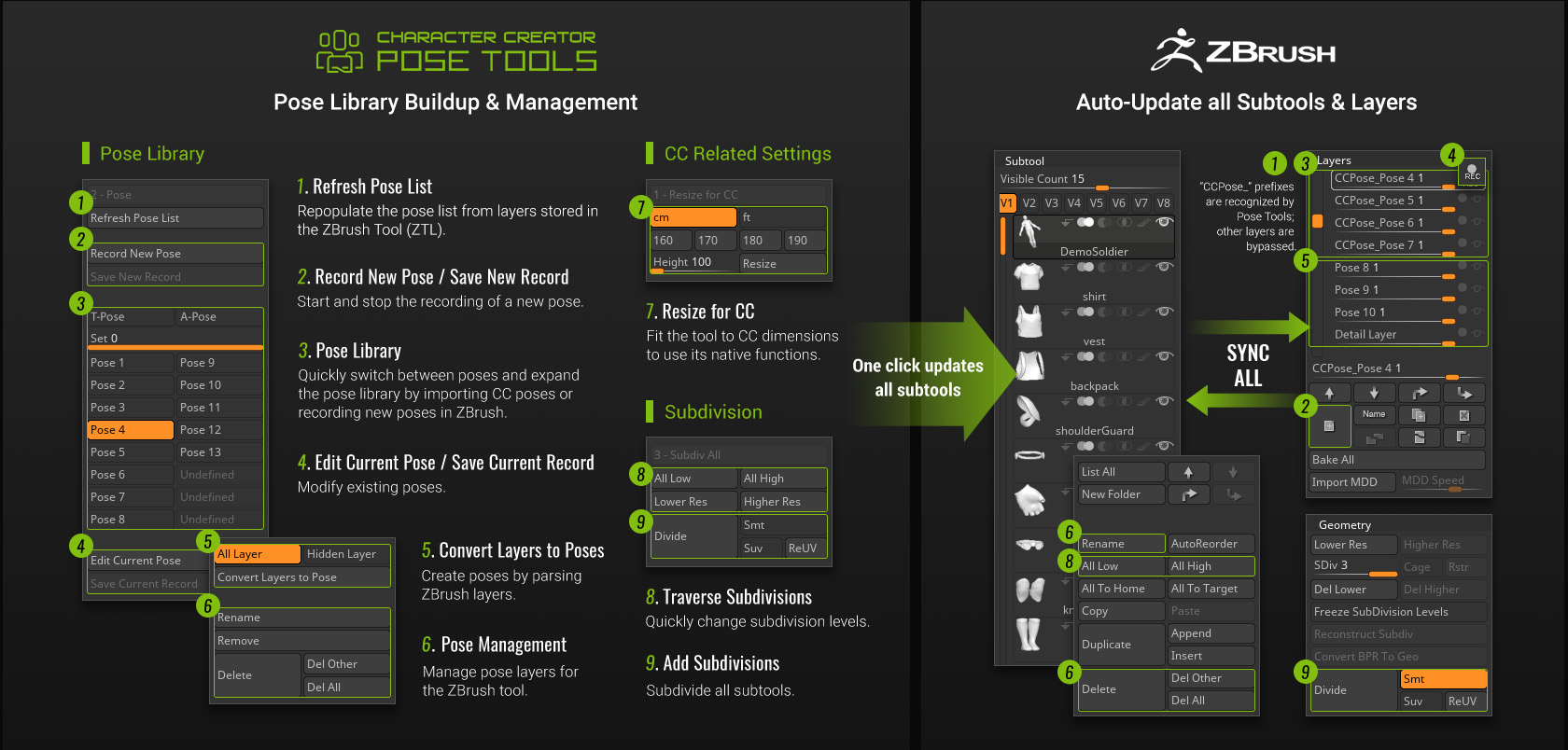 The Character Creator (CC) Pose Tools for ZBrush seamlessly integrates with ZBrush layers, facilitating CC’s automated rigging, posing, and real-time updates across all subtools. Alongside pose management, it allows intricate detailing of character designs at high resolutions, letting you refine poses with precision.