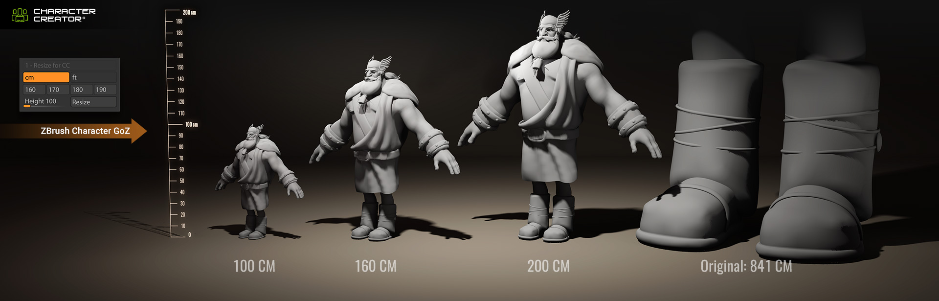 ZBrush models can be resized to match the scale conventions in Character Creator, a crucial initial step towards achieving accurate auto-rigging and posing compatibility between these two programs.