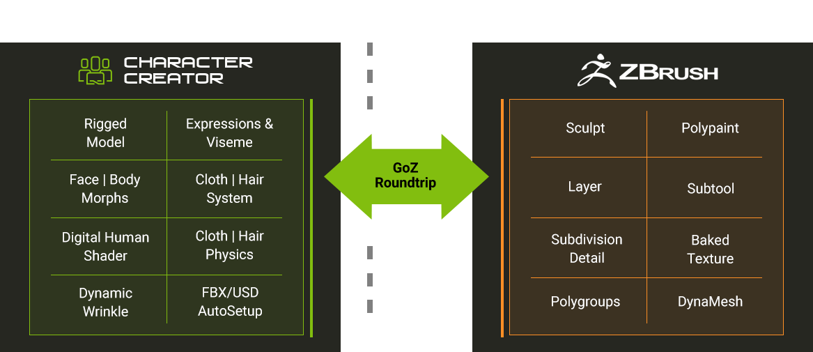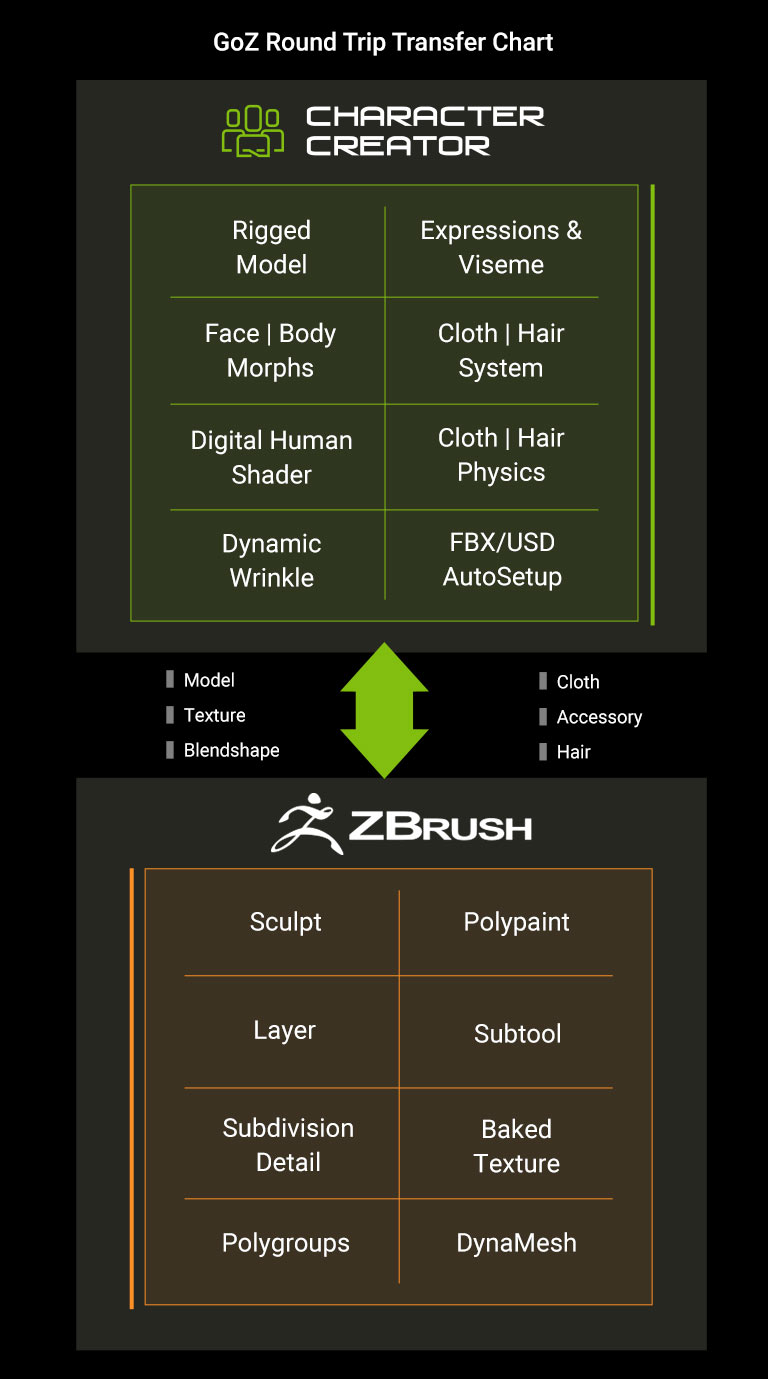 The seamless GoZ design loop positions ZBrush as an essential tool for crafting character designs and custom assets. Conversely, the streamlined sculpting workflow with Character Creator makes full-body modeling a breeze. Whether creating detailed clothing, shaping hard mesh accessories, or generating unique expression styles, the entire process becomes effortless with convenient single-click updates.