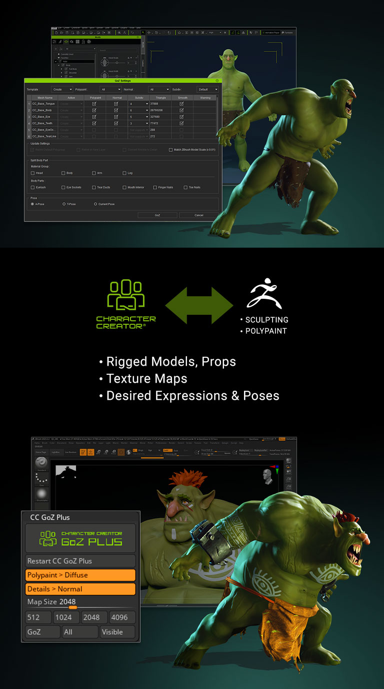 Sending CC Diffuse and Normal maps to ZBrush as polypaint and displacement is optional in GoZ. In ZBrush, diffuse and normal maps for Character Creator are managed using editable polypaint and displacement layers. Begin by importing the CC character into ZBrush, allowing for detailed sculpting and painting. Then, bake and transfer these changes back to Character Creator as an updated base figure with modified diffuse and normal maps. This adaptable two-way workflow empowers artists to enrich characters and integrate outcomes for dressing, accessorizing, and beyond.