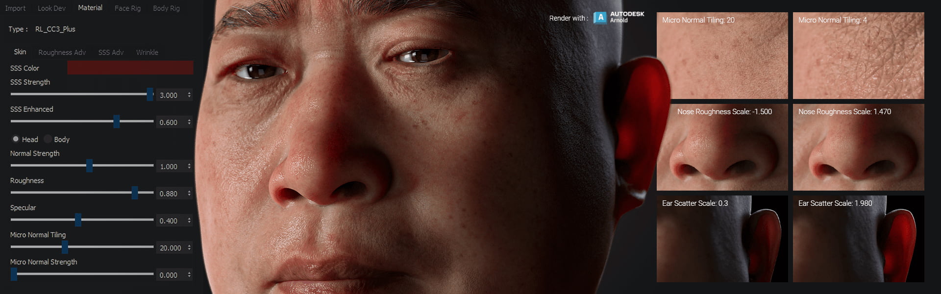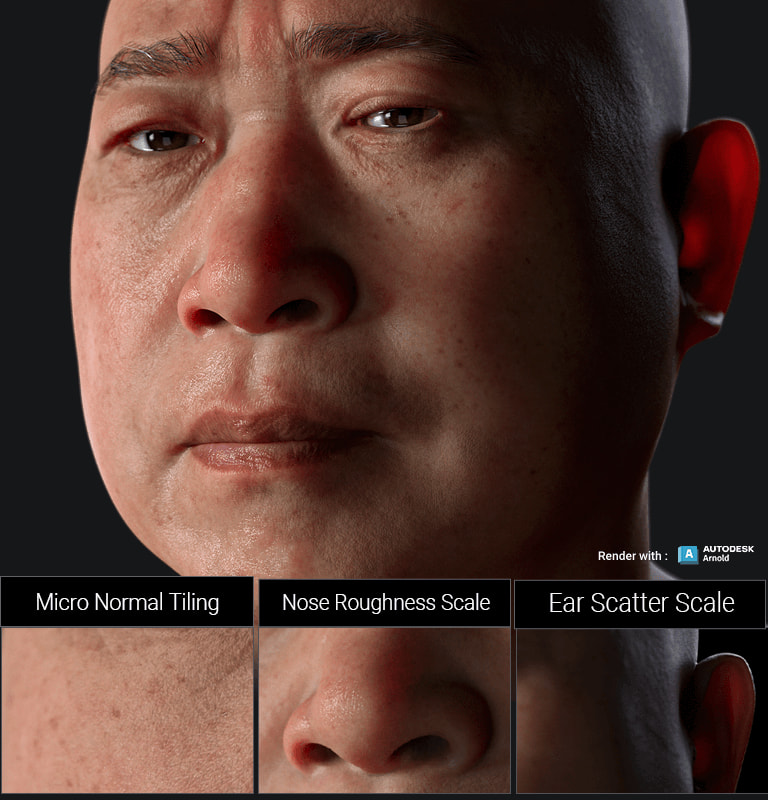 The Digital Human Skin shader provides adjustable subsurface scattering, roughness, specularity, and micro-normal properties for achieving lifelike results. These parameters can be finely adjusted based on editable sliders provided by four-channel RGBA color masking.