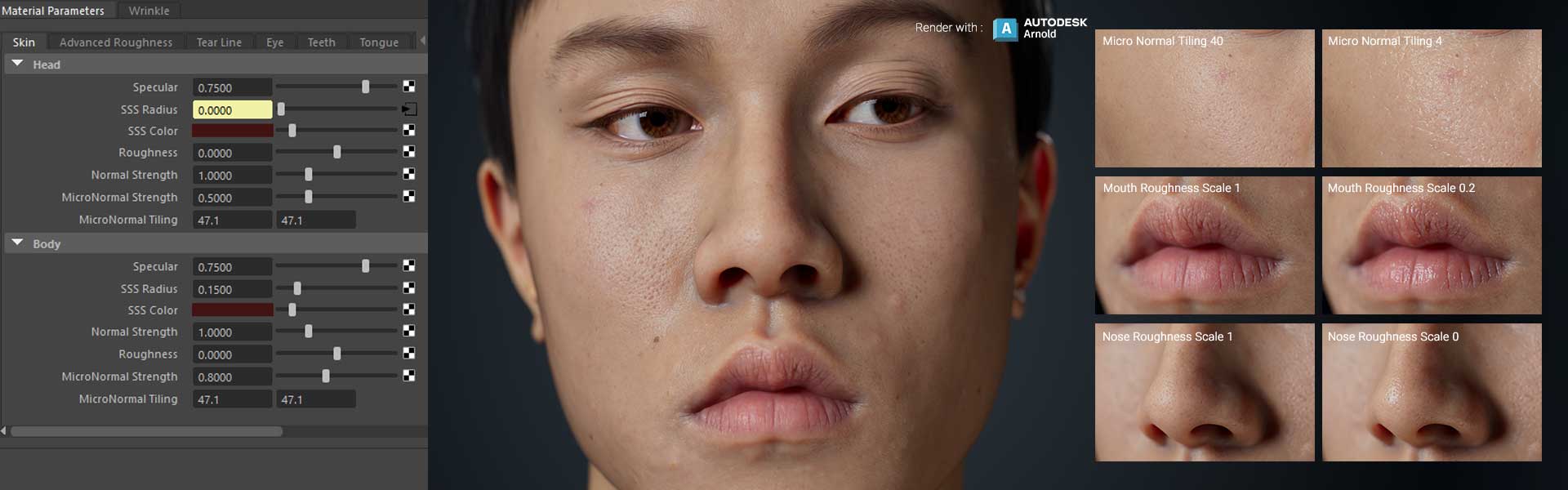 The CC Digital Human Skin Shader provides adjustable subsurface scattering, roughness, specularity, and micro-normal properties for achieving lifelike results. These parameters can be finely tuned for regional adjustments designated by 4-channel RGBA color masking.
