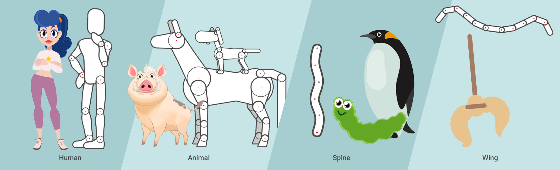 Setup intricate 2D character rigs using custom bone structures, with pins to define static regions.