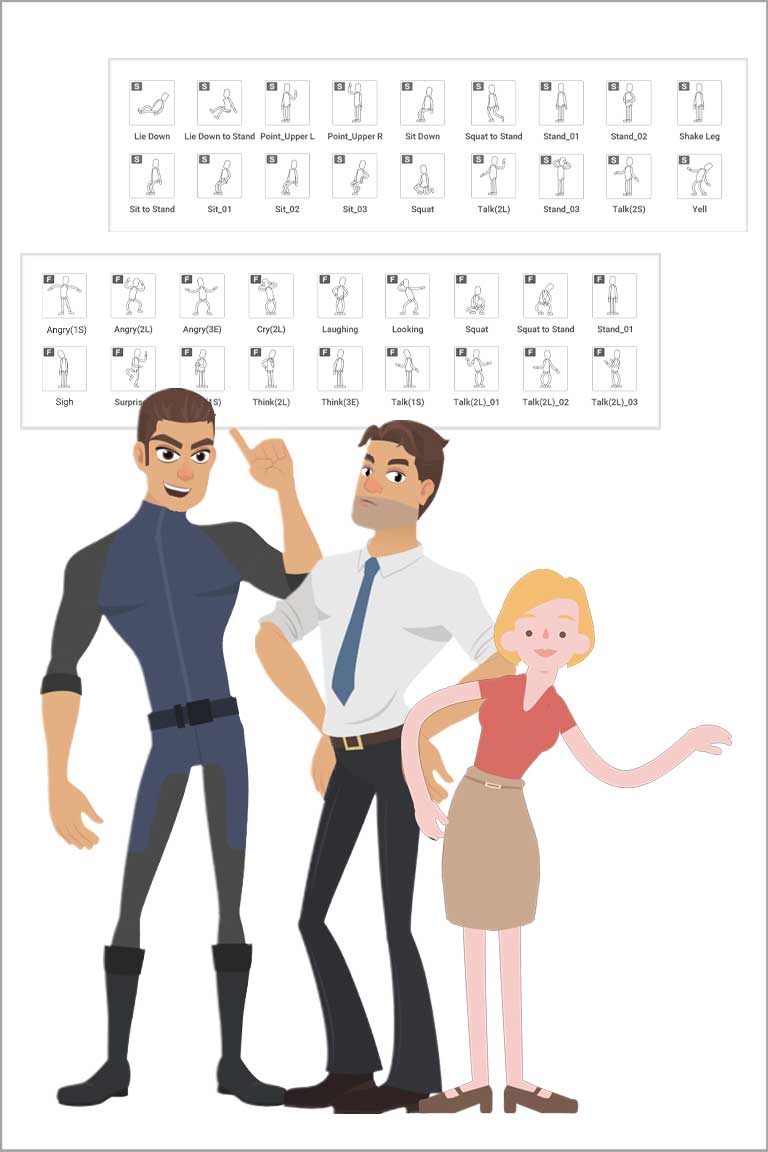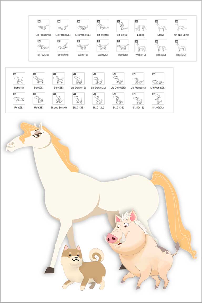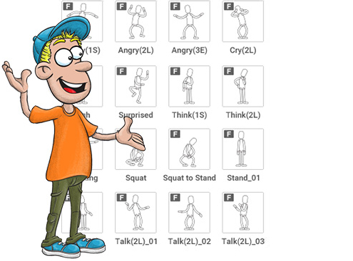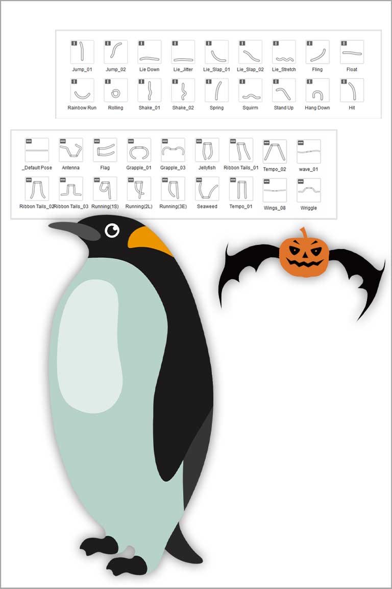 To save effort on custom bone-rigging and key frame animation, we provide full facial and body rigged character templates to allow users to utilize shared bones structures while enjoying a huge library of cartoon motions.