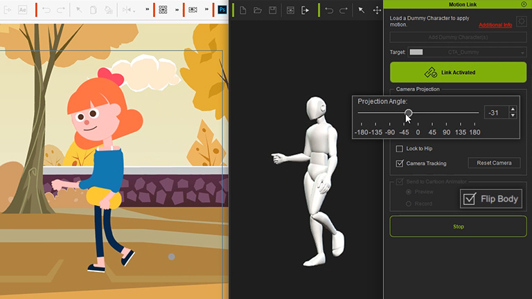 Cartoon Animator expands the creative possibilities with 3D motions for 2D animation. Motion Link is a plugin that links iClone and CTA for a real-time 3D motion pipeline for 2D characters. Users can real-time preview 2D animation with 3D motions from iClone, fine-tune the animation with customizable projection angles, and record the editing process to ensure the best animation quality. * Operating System: Windows Only