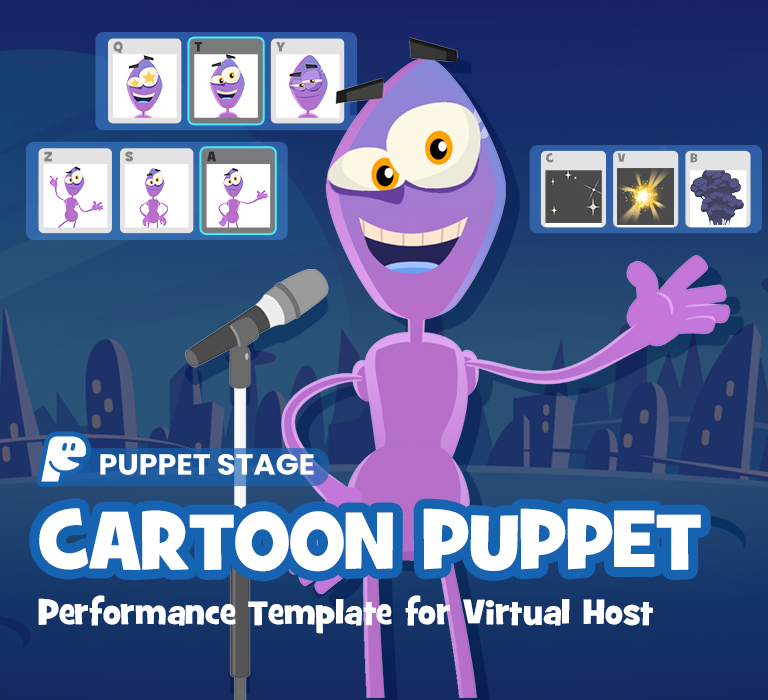 Put on a show with premade motions, facial tracking, VFX, animated props and backgrounds deployed directly onto the Puppet Stage. Trigger multiple animations with communal hotkeys, or adjust image opacity to fade or hide elements.