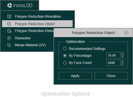 In most cases, the high polygon reduced mesh can keep high visual details without noticeable degradation. Optional UV Merge and texture size reduction are also supported.