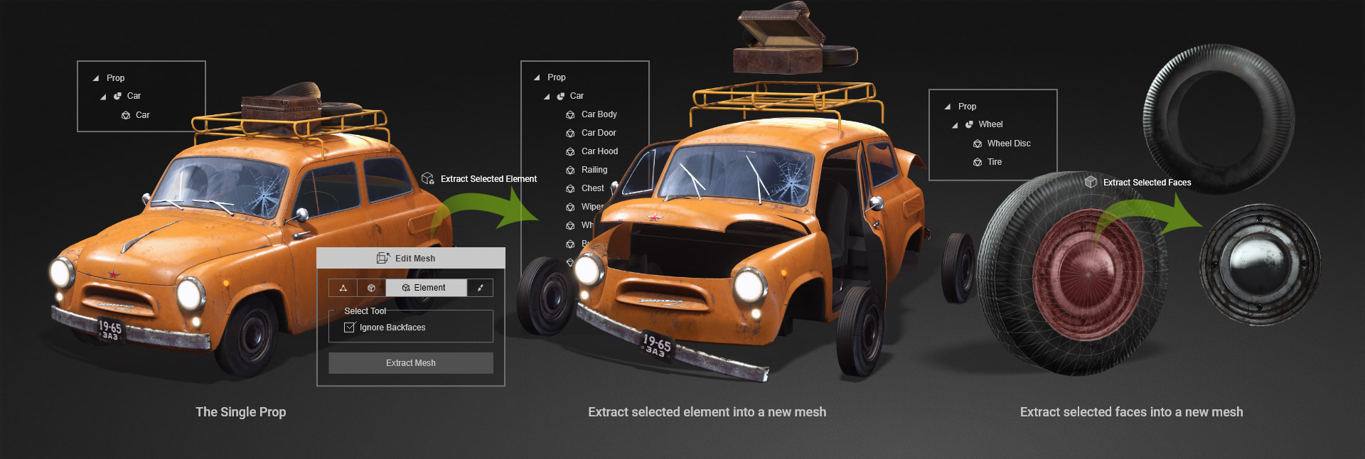 Extract, merge, rearrange node hierarchies, skin weight edit, pose edit, mesh edit, and polygon reduction.