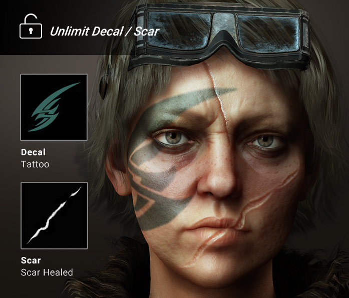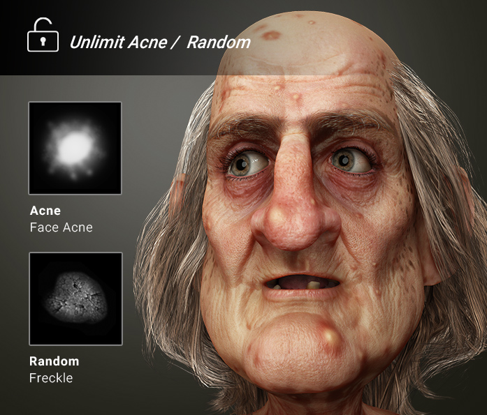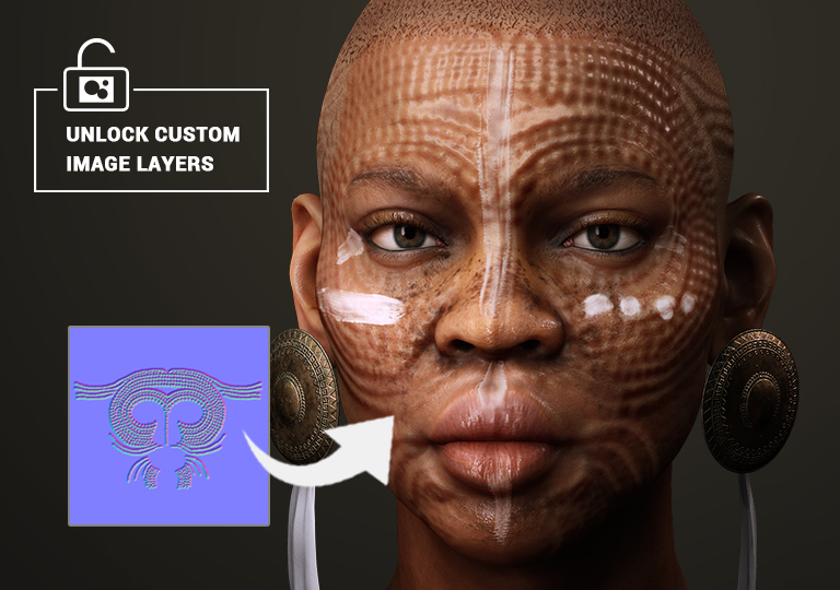 Blemishes, tattoos, sweat and wounds are essential to many character designs. Apply image patterns in combination with imperfection tools to achieve the desired result.