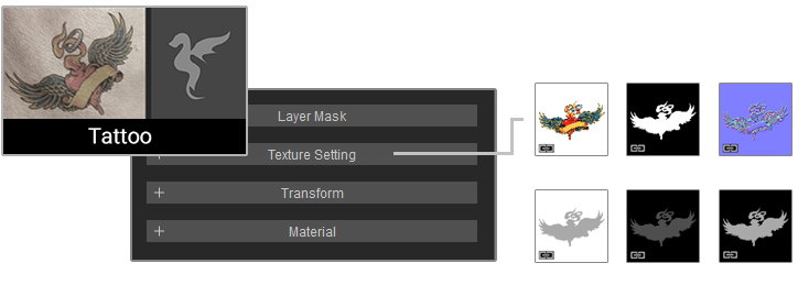 Create an amphibious look for your character, ranging from animals found in nature such as snakes to totally alien appearances. Or recreate looks from movies and fantasy settings like Mystique in the X-men series. Apply three alpha patterns and alpha range images for each of the three sections and freely deploy multiple Transform modifications.