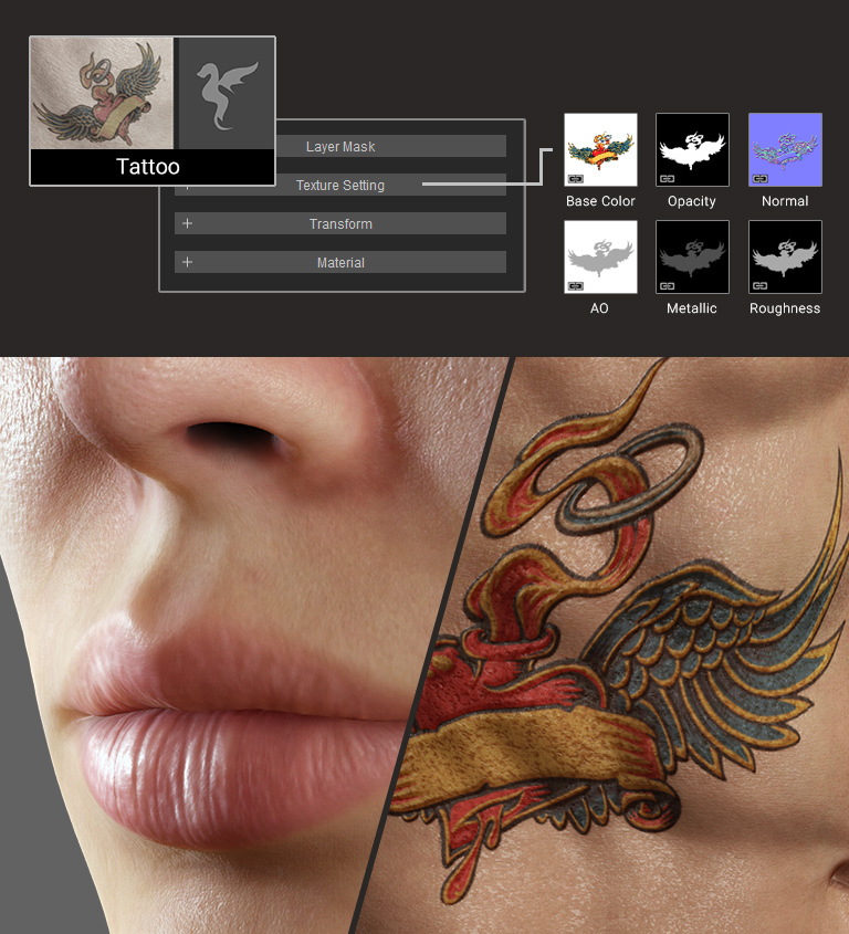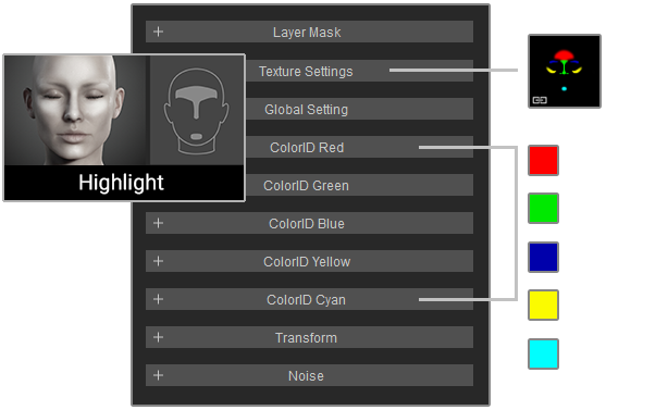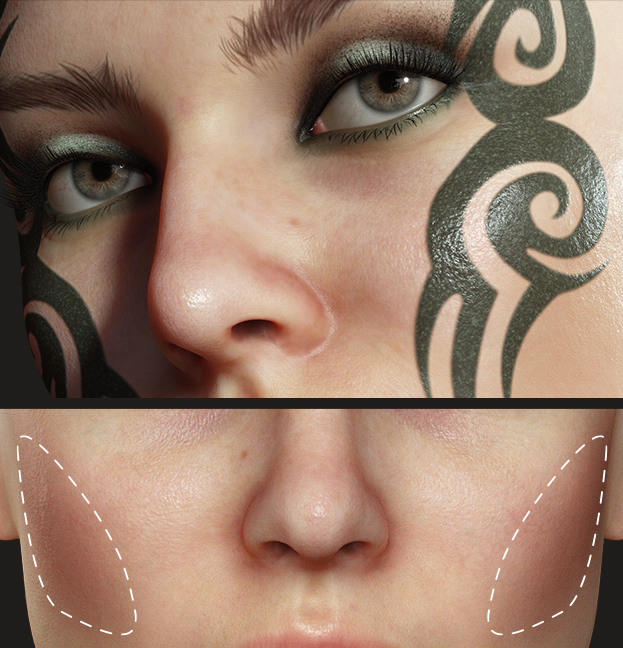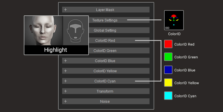 Use one ColorID map to define five effective ranges with each having its own normal strength and material settings. Global Noise and Transformation section is provided for overall tuning. The Noise Color tool is particularly useful for effects like makeup foundations, glittering cosmetics, and carnival body paint. Multi-area material adjustments and noise blend are available for natural skin overlays.