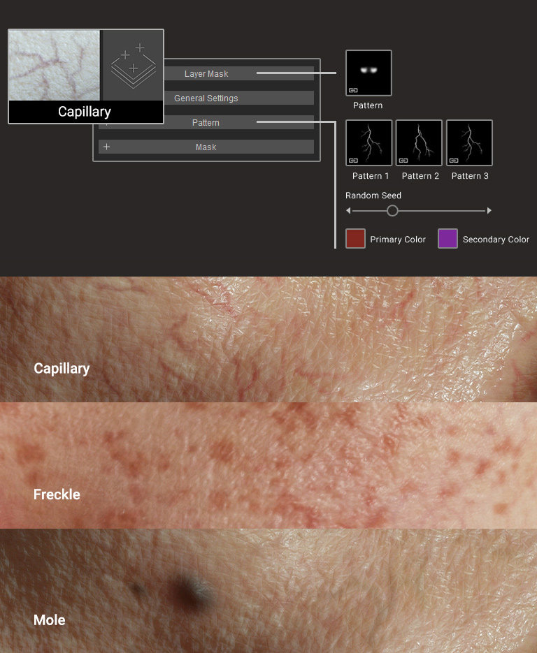 The Random tool can be used to create capillaries, freckles, and moles by scattering irregular patterns across a surface. Support for 3 alpha patterns, primary + secondary color blending, and tri-planar projection makes for an infinite set of possibilities for patterns spread seamlessly across multiple materials.