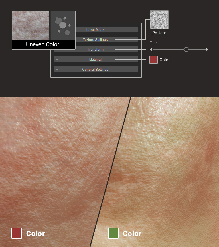 At a closer view, real human skin is actually a patchwork of uneven colors which can be naturally mimicked with the cross-material Tile tool. Given a seamless alpha pattern, the Tile tool can colorize with varying levels of opacity, change tiling offset, transformation, expand, blur, or material effects.