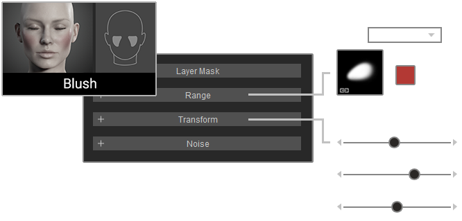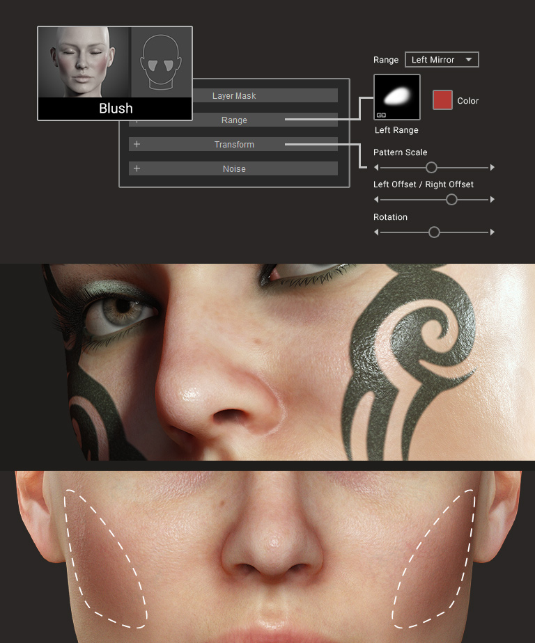 As the name implies, the Mirror tool is designed to create mirroring effects. You just need to place a alpha range mask at one side, then you can get the identical effects on the other side. The range can be scaled, rotated, and moved. You can also color it, expand it, blur it, or add noise effects for a natural blending with the underlying skin. Blush, symmetrical Tattoo are typical uses of this tool.