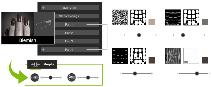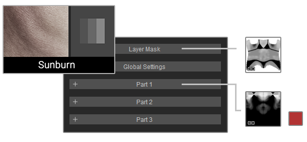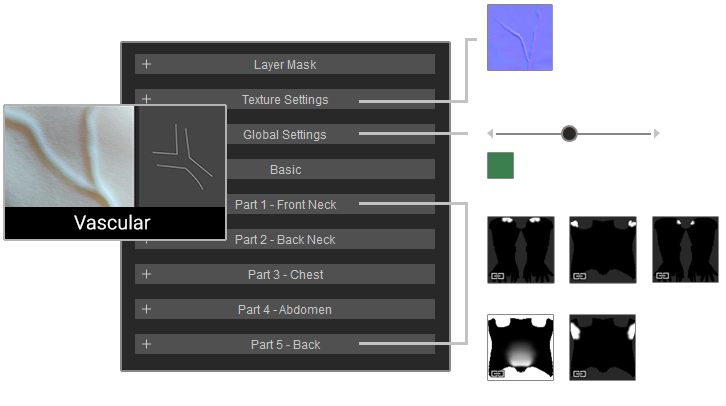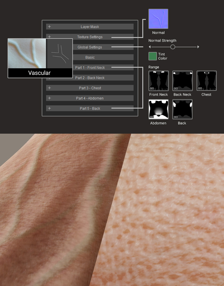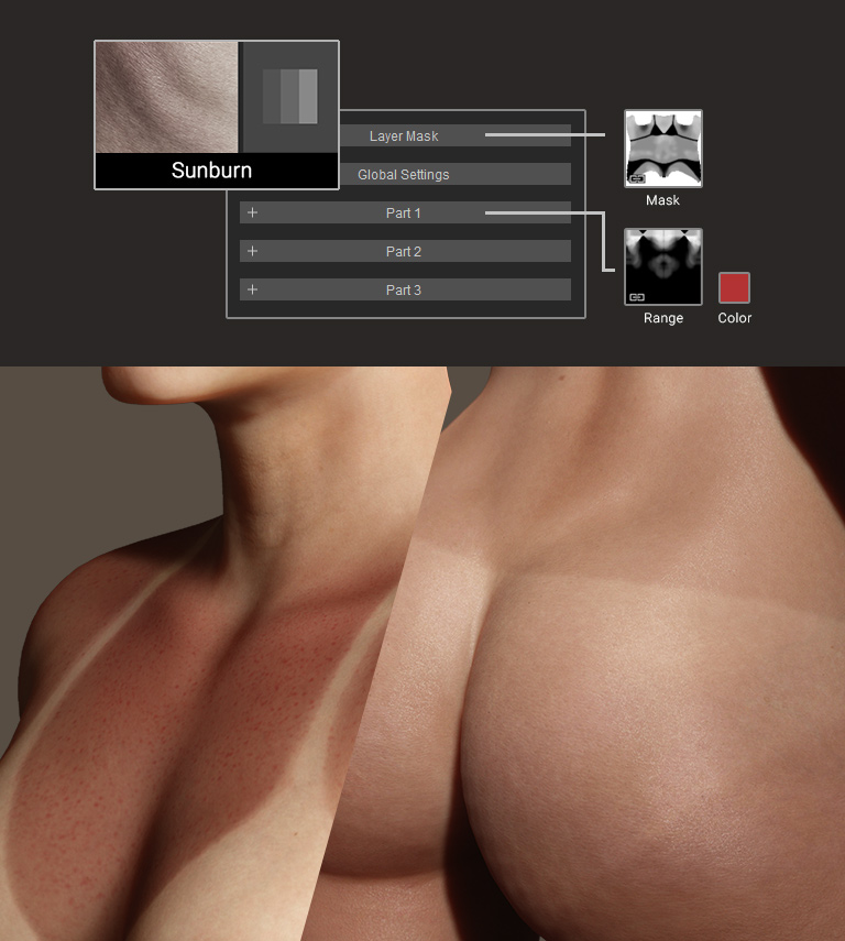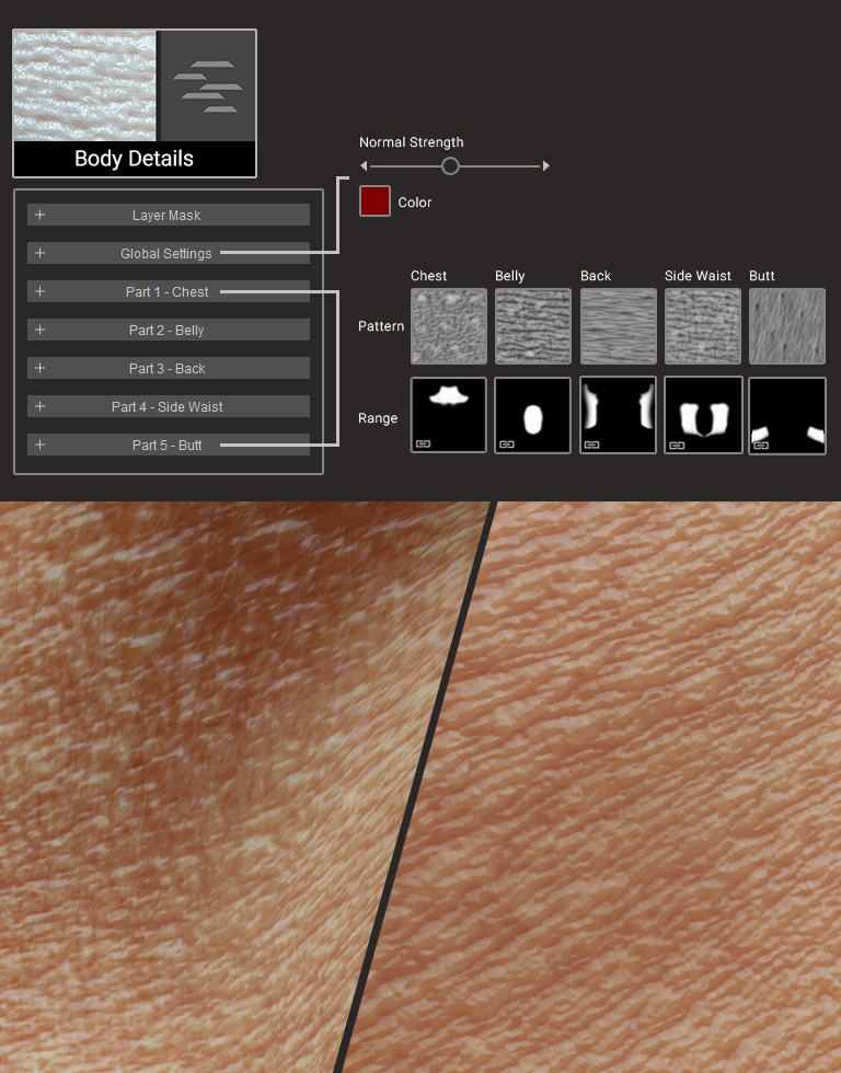 Part Control tool is suitable for applying color differences in large ranges such as suntans. Apply up to three range masks to determine the effective areas, with support for different colors and materials. Normal and Micro-normal effects are also applicable.