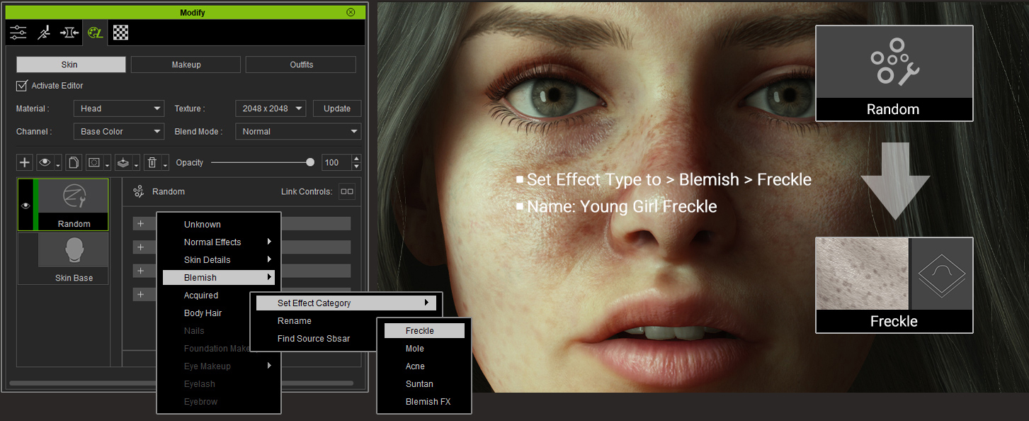 Dream up different looks for the skin or layer on makeup effects -- SkinGen tools are flexible and easily accessible via a consolidated library.