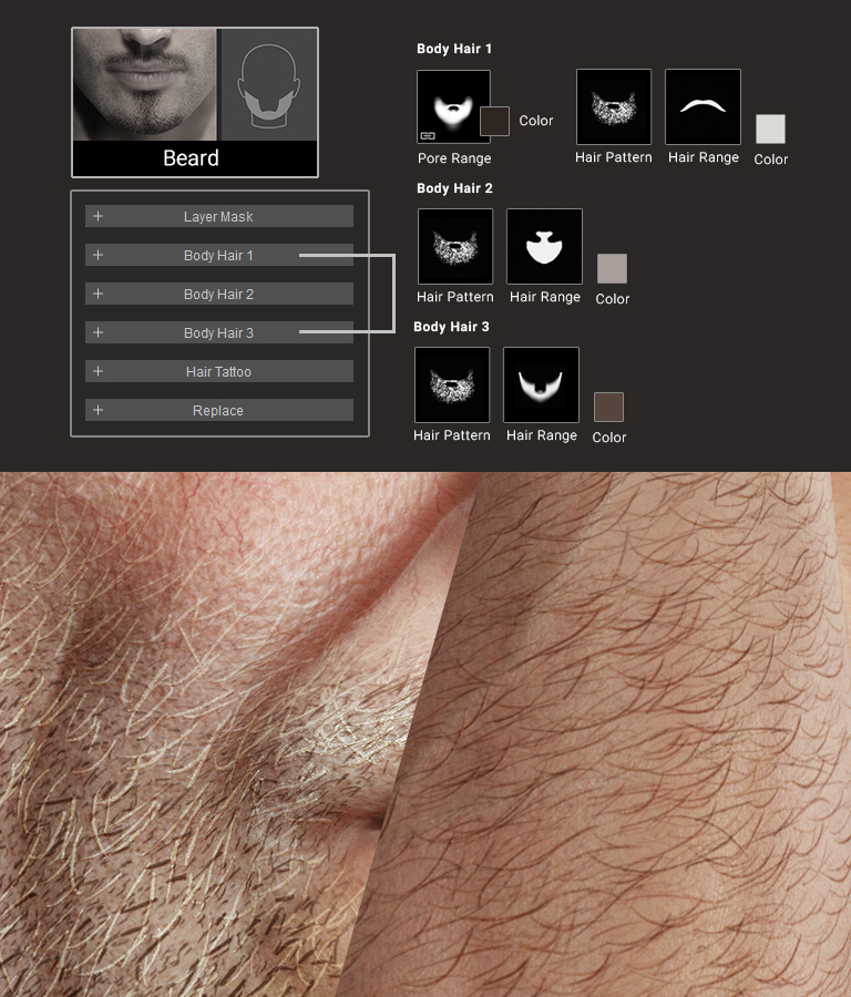 The Body Hair Plus, unlike Body Hair, has three layers, with each one supporting a alpha pattern, a range map for the hair, and a range map for the pores to achieve a shaved look.