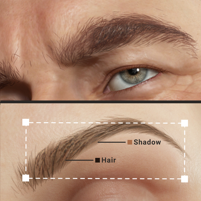 Eyebrow tool is designed for realism with hair and shadow layers. Only one colored eyebrow image is needed and the other side is automatically projected. You can apply an alpha range map for the shape of the shadows and then adjust the colors. Adjustments in the Transform section allows you to move the eyebrows to the ideal position. Import a scanned character, and use Replace to cover the original eyebrows with this tool.