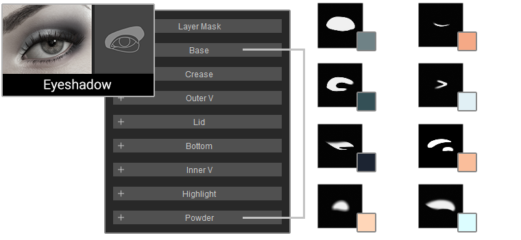 Our highly versatile eyeshadow makeup effect supports seven distinct sections, each supporting its own unique alpha range. Utilize adjustable colors, blur, and powder adjustments to achieve a look you desire and power your way through the fashion catwalk!