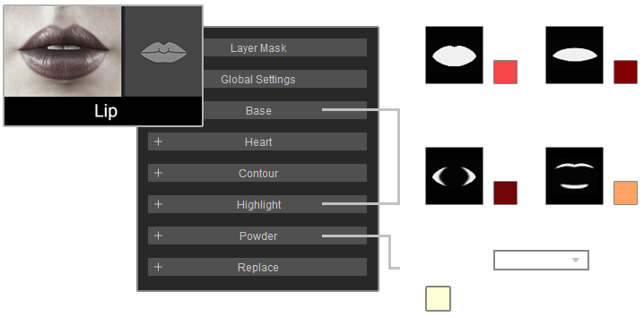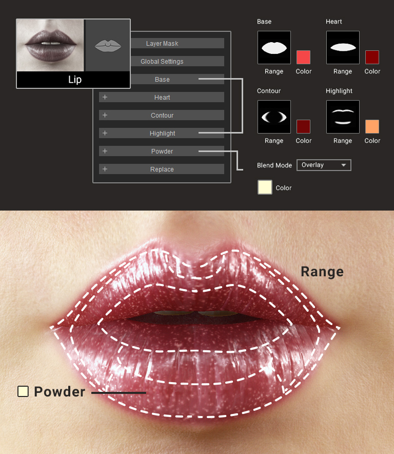 Pucker up with baby pink lips or classic vintage look, and everything in between. The Lip tool has Base, Contour, Heart and Highlight sections inspired from professional makeup artists. Redefine lip ranges with four alpha range images with adjustable colors for each section. Create various lip textures, glitter effects with corresponding material and powder effects.