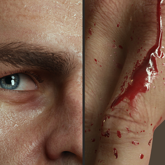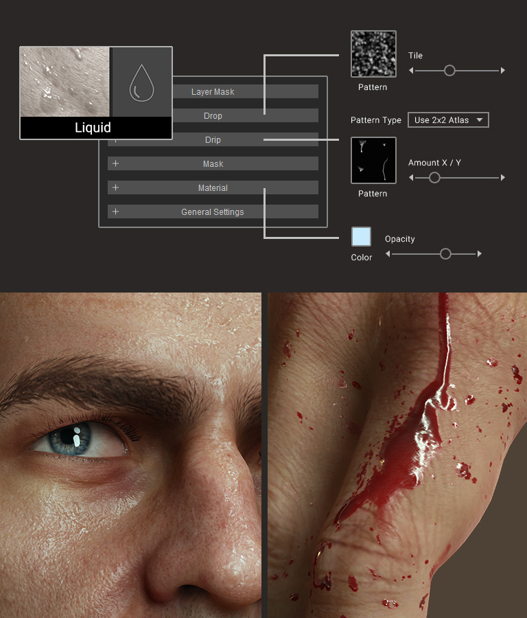 Liquids like sweat are important elements for showing the character in different states. There are two styles for the Liquid tool: Drop and Drip -- Just apply an alpha pattern for each and use the multiple transform sliders to create naturalistic effects and distortions. Change the color, opacity, roughness and more to simulate other effects like blood, glue, wax, etc.