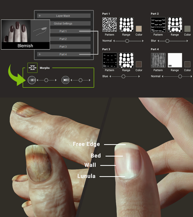 Realistic in nature, the Nail tool is separated into four parts: Bed, Free Edge, Lunula, and Wall. You can adjust the details directly or redefine the range of the four parts by applying an alpha pattern and a range image for each section. Furthermore, fine-tune the ridges and dirt on the nails. Create manicured, healthy, old, or broken nails -- or go crazy with special effects by changing out input maps and textures.