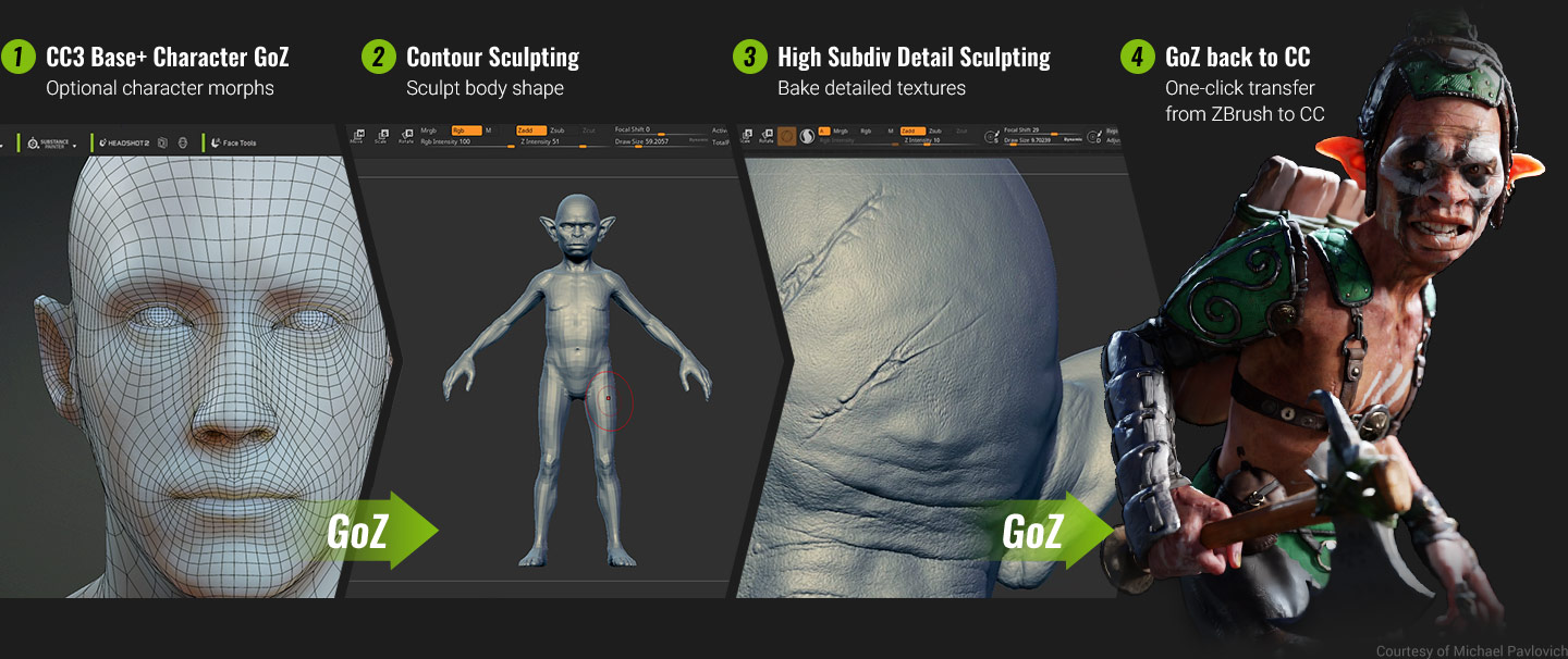 Begin with a preliminary version of the fully-rigged CC base model; use GoZ to enhance its appearance through ZBrush sculpting or painting; and seamlessly return to CC. Marvel at the shape and texture transformation, accompanied by personalized facial and body animations.