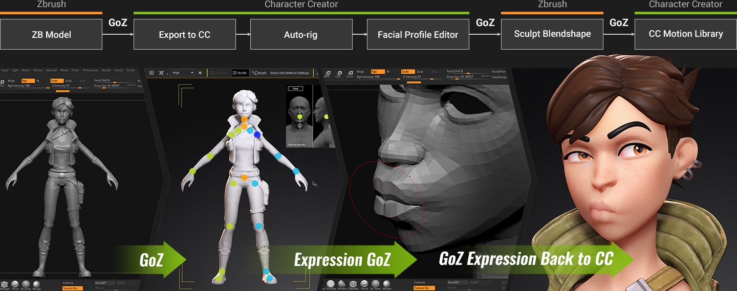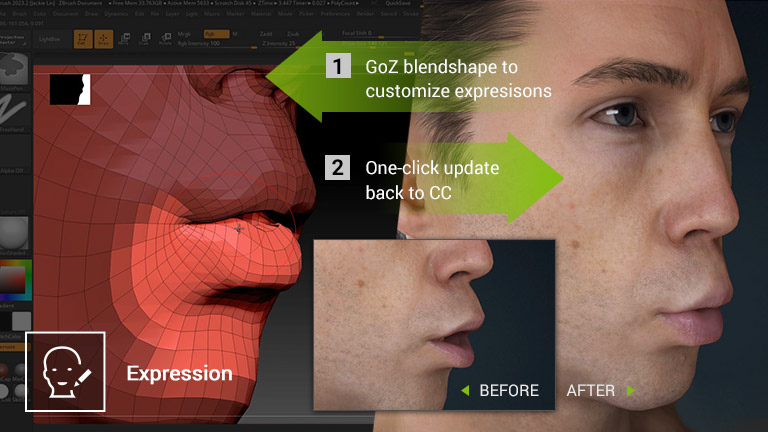 The seamless GoZ design loop positions ZBrush as an essential tool for crafting character designs and custom assets. Conversely, the streamlined sculpting workflow with Character Creator makes full-body modeling a breeze. Whether creating detailed clothing, shaping hard mesh accessories, or generating unique expression styles, the entire process becomes effortless with convenient single-click updates.