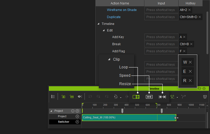 Once you are highlighting a specific interface, such as Timeline, Modify Panel, or Motion Capture, the local keys will take effect.