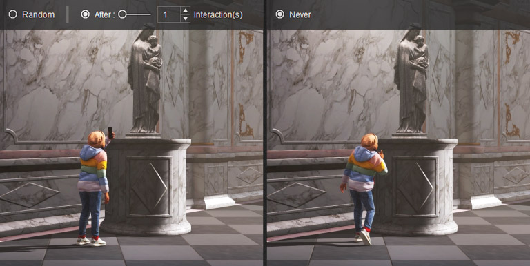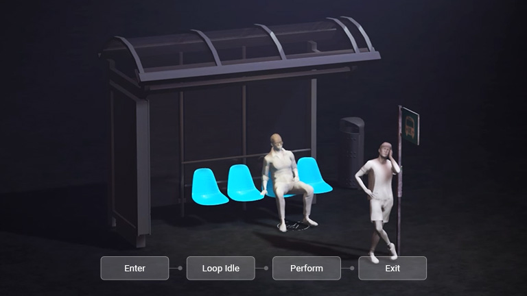 Just as in daily life, the angle at which a person starts to interact with a prop matters in how the motion unfolds. The MD chair prop offers 8 different entry performances, each tailored to a specific interaction angle. These trigger motions are also available in both male and female styles.