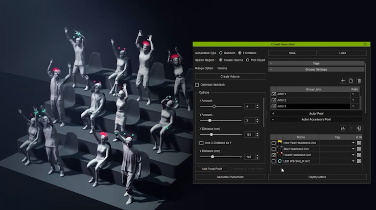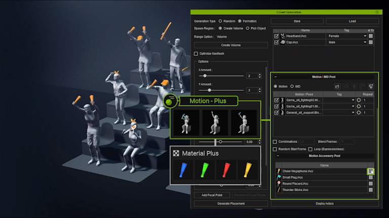Flexible motion pairing for Smart Accessory is essential for spawning and orchestrating large virtual crowds. Automatic assignment of interactive props, along with distinct accessories such as hats, glasses, and handheld items helps to differentiate each individual.