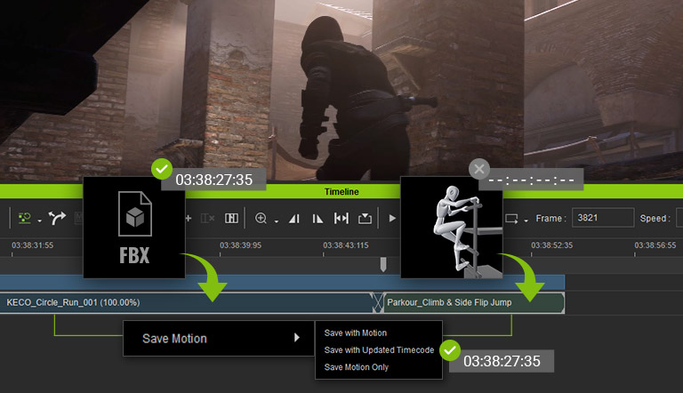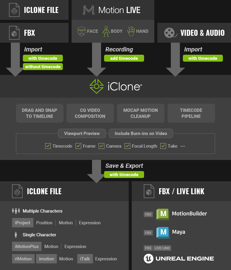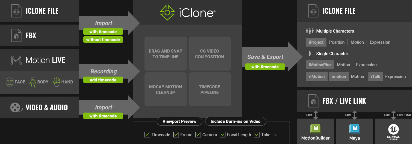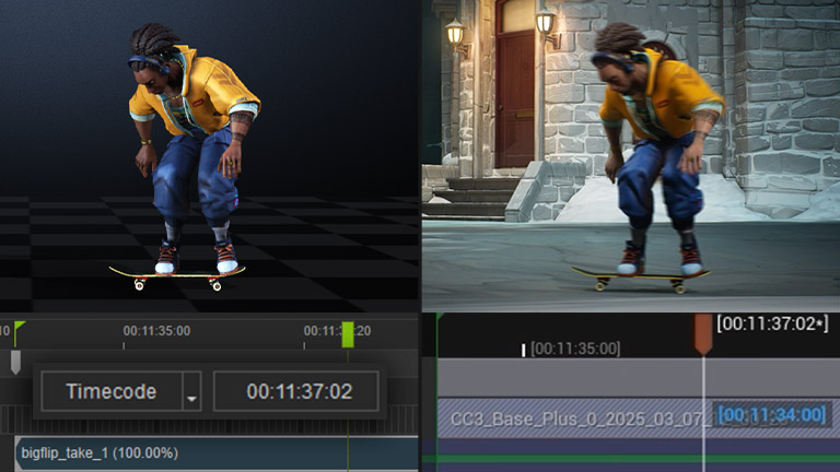 iClone Timecode enables a fully integrated timecode pipeline that powers synced mocap, matching frame rates, motion editing, and CGI with video compositing. The bidirectional FBX timecode exchange works seamlessly with other timecode-compatible software, including Maya, MotionBuilder, and Unreal Engine.