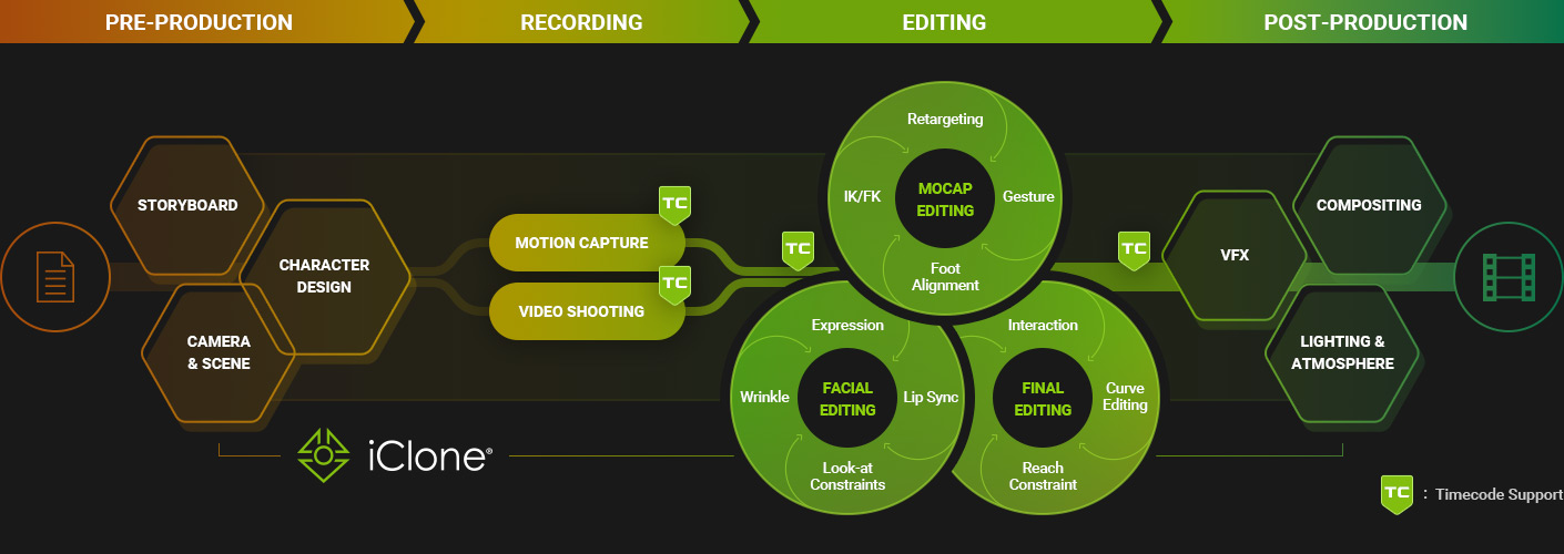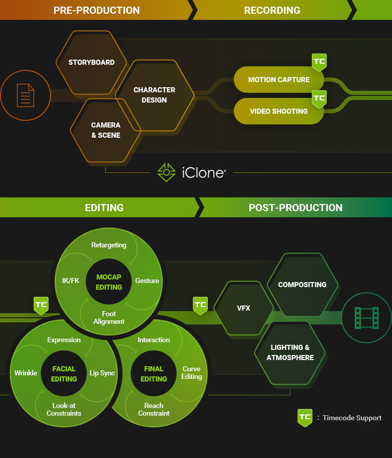 Motion LIVE for iClone is a complete full-body motion capture platform that streams motion data from top-tier mocap devices, tracking 3D character faces, hands, and bodies in real-time. With iClone Timecode, every recording source stays locked in sync for perfect harmony.