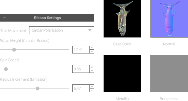 Elongate one particle into a long trailing ribbon, or select the pattern defined in the sprite sheet with your own width and twist variations.