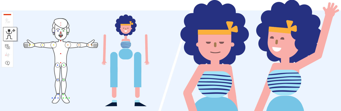 目前角色搭載 360 頭部、延伸骨頭、大頭針及彈性行為…唯一留下來需要微調的是臉部五官(用 Photoshop 及 Illustreator 皆同)。更新後之彈性素材設計讓此處理過程如多變性的微風,可滿足您所有需要。