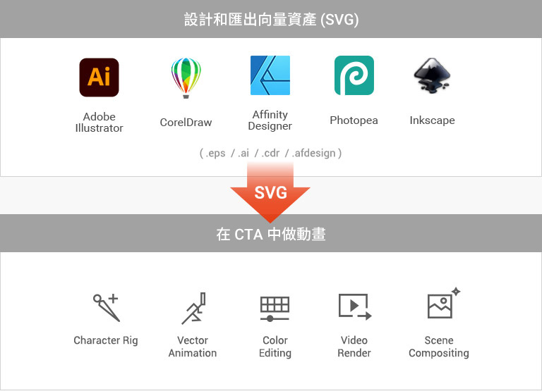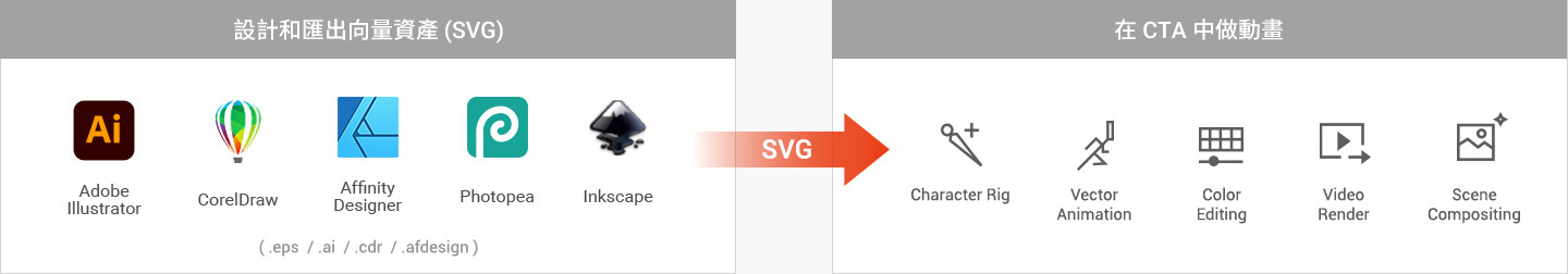 我們打破向量圖樣和動畫的藩籬 - 使用向量工具將存於當今各種格式中的向量圖樣轉成 SVG,然後匯入至 Cartoon Animator,利用其強大的綁定、動態、顏色編輯、影片算圖及場景組合功能