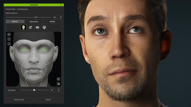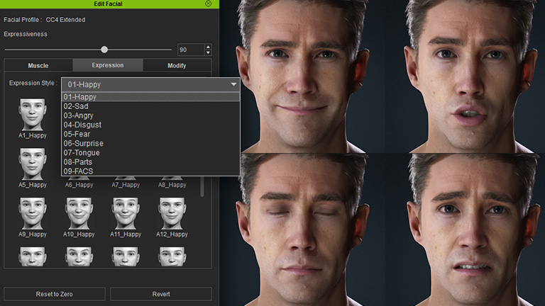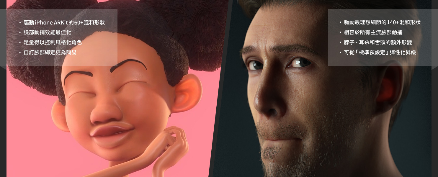根據使用者選的專案類型提供兩等級的「表情預設定」。用於「標準級」的 60+ 形變相容所有比如 ARKit 的臉部動捕,且對互動 XR 或遊戲而言皆效能友善。用於「延伸級」的 140+ 形變則精準控制角色表情的細微差異,最適用於擬真製作或 AI 驅動的數位人物。