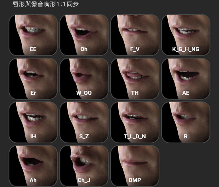 嘴巴形狀自訂功能用於 CC 替身及「人形」角色。依預設,所有 CC 角色皆支援 8 唇形加 7 舌形的「音素配對」。想要帶入自訂掃瞄模型或風格化角色的設計師則可得利於更易對應的 1:1 嘴型(單音單形)。 請參閱 iClone AccuLips頁面及 對嘴動畫大賽使用者作品 > 參考線上指南 >